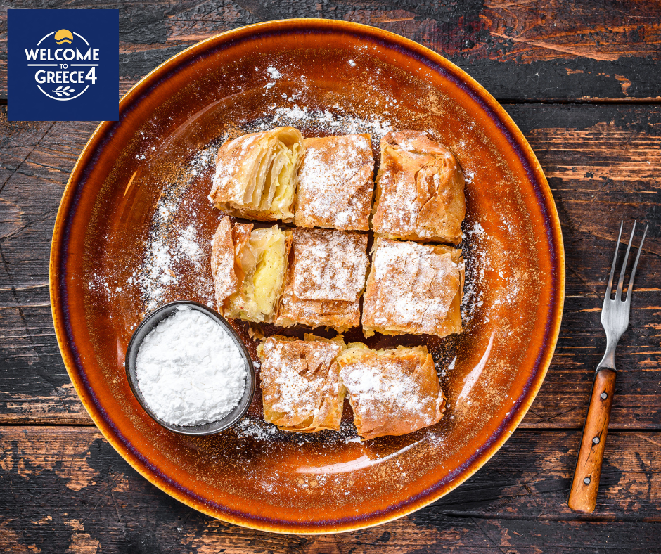 Originally from Northern Greece, bougatsa features a custard or cheese filling and is traditionally enjoyed with powdered sugar and cinnamon.