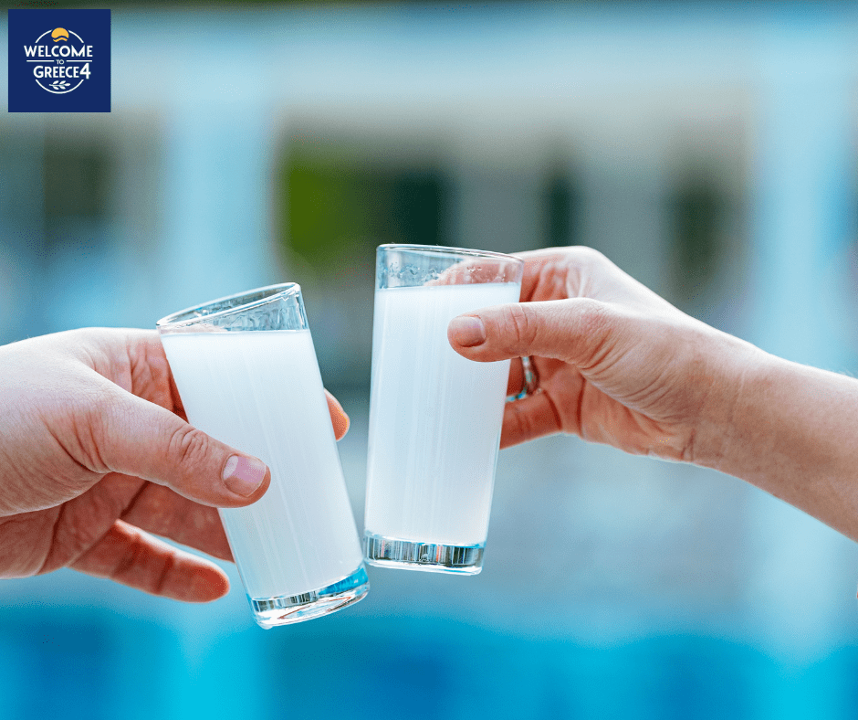 Drink Raki (Tsikoudia), a strong grape-based pomace brandy, offered as a sign of hospitality.