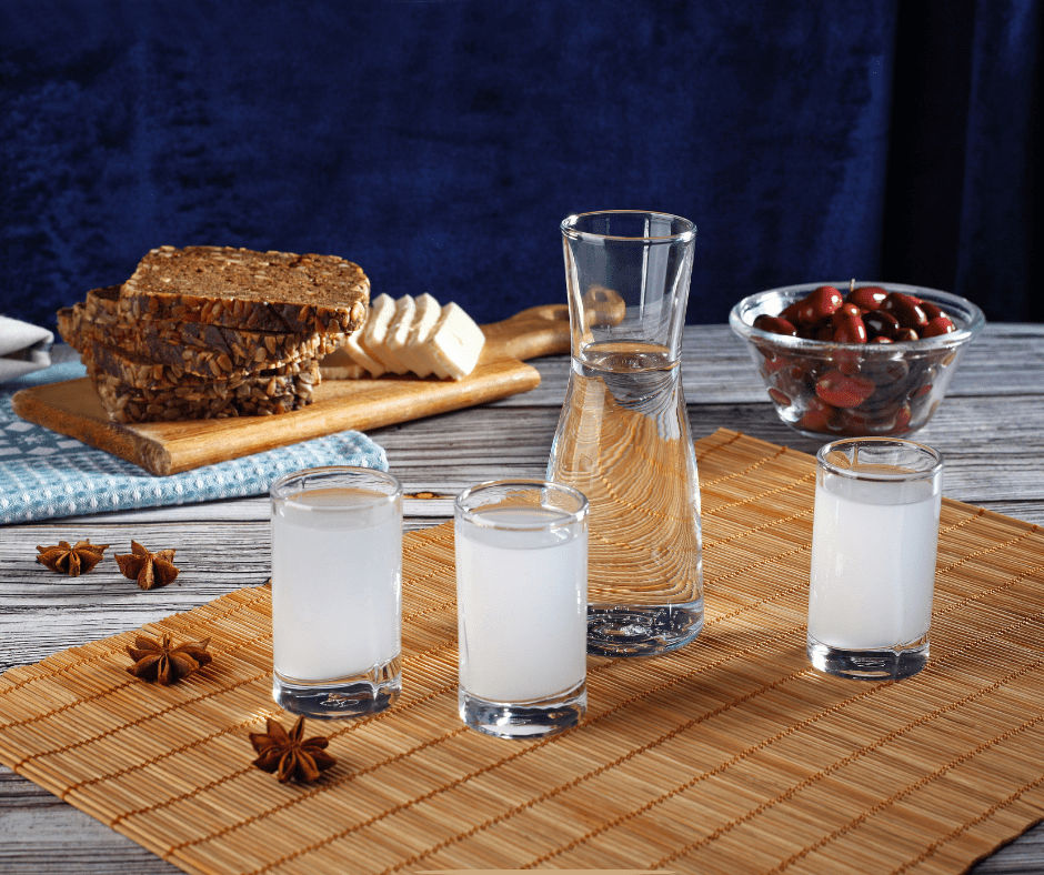 Drink Raki (Tsikoudia), a strong grape-based pomace brandy, offered as a sign of hospitality.