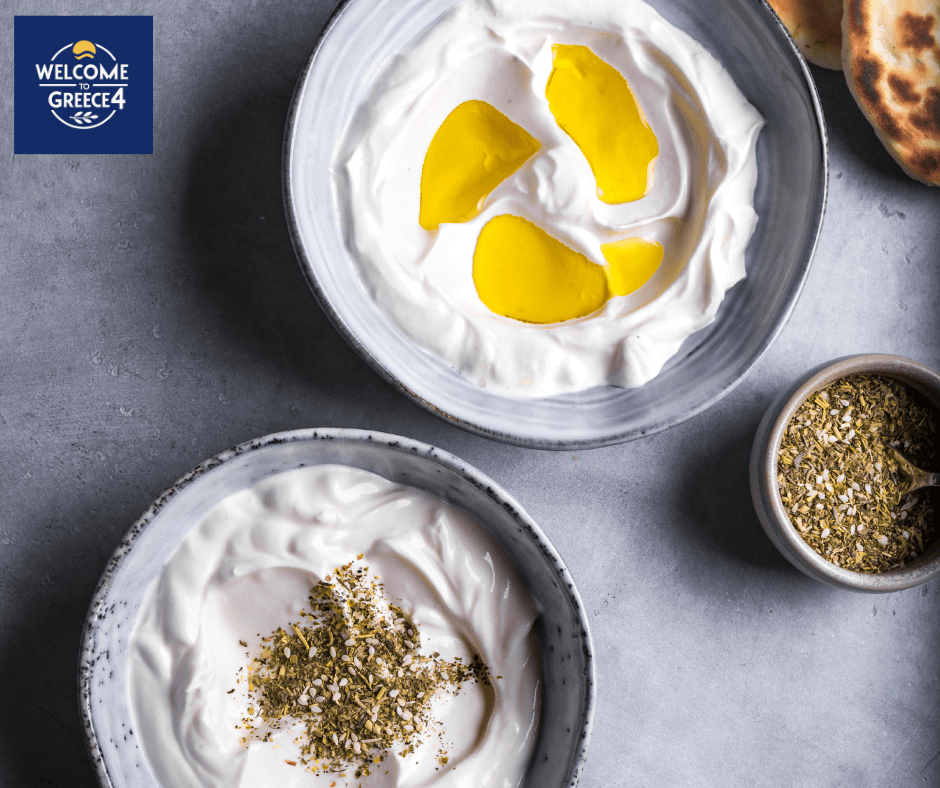 Add yogurt, olive oil, lemon juice (or vinegar), and garlic (if using).
