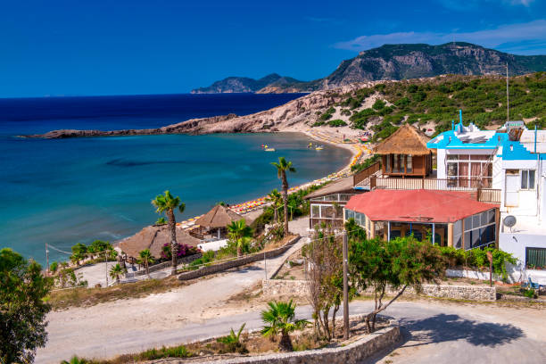 The north coast, caressed by calmer waters, presents family-friendly stretches like Tigaki, a long, sandy haven perfect for leisurely swims and kitesurfing, and Marmari, with its shallow, crystal-clear waters.