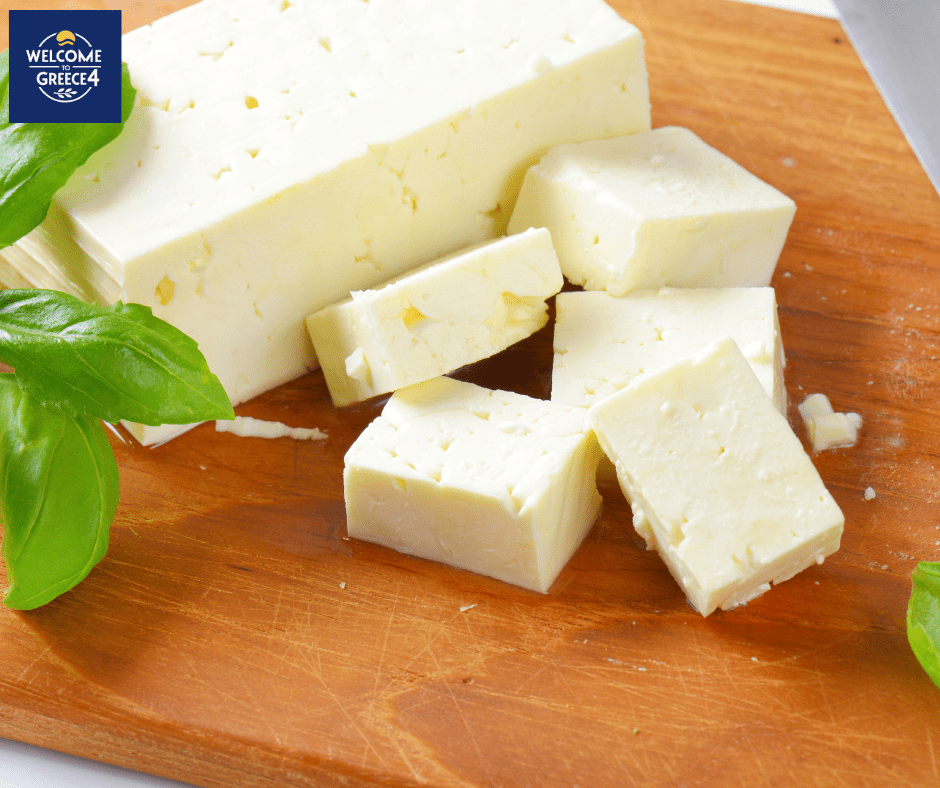 Feta, Greece's most famous cheese, is a brined curd cheese traditionally made from sheep's milk or a mixture of sheep and goat milk; it has a tangy, salty flavor and crumbly texture, often used in salads, pies, and baked dishes. Graviera